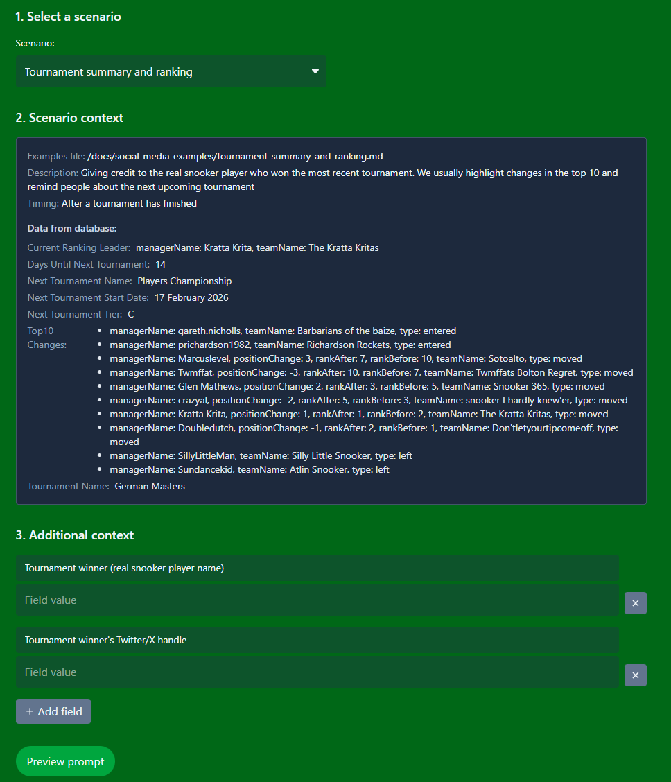 Min approach var å lage en ny feature i min applikasjon (som bare jeg har tilgang til), hvor jeg kan mate språkmodellen med akkurat den informasjonen den trenger for å lage et utkast. Jeg inkluderer altså informasjon som jeg selv ville ha brukt i betraktningen når jeg lager en ny post, og jeg inkluderer eksempler på tidligere poster for å gi KI bedre forståelse om hvordan postene er strukturert og tonen i kommunikasjonen.